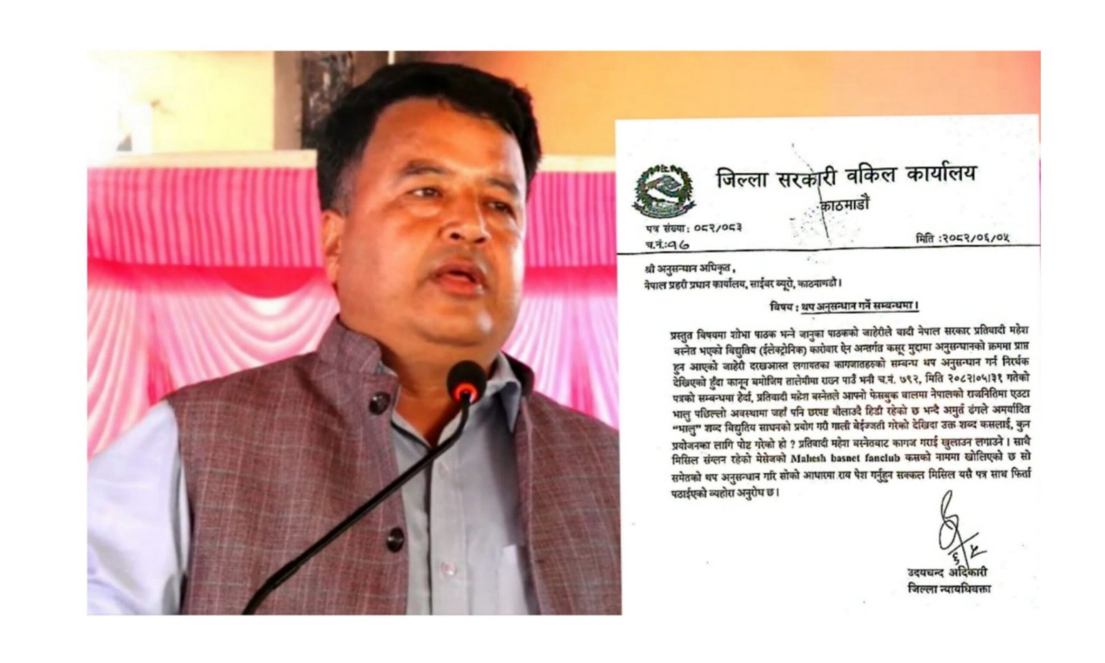 २०८२ असोज १४ काठमाडौं । नेकपा एमालेका नेत्ता महेस बस्नेत माथी थप अनुसन्धान गर्न शोभा पाठक भन्ने जानुका पाठकको जाहेरीले जिल्ला सरकारी वकिल कार्यालय काठमाडौंले मिति:२०८२ असोज ५ गते जिल्ला महान्यायधिवक्ता उदयचन्द्र अदिकारी द्वारा हस्ताक्षर गरिएको पत्र नेपाल प्रहरी प्रधान कार्यालय, साईबर ब्यूरो, काठमाणडौ लाई पठाएको बुझिएको छ ।