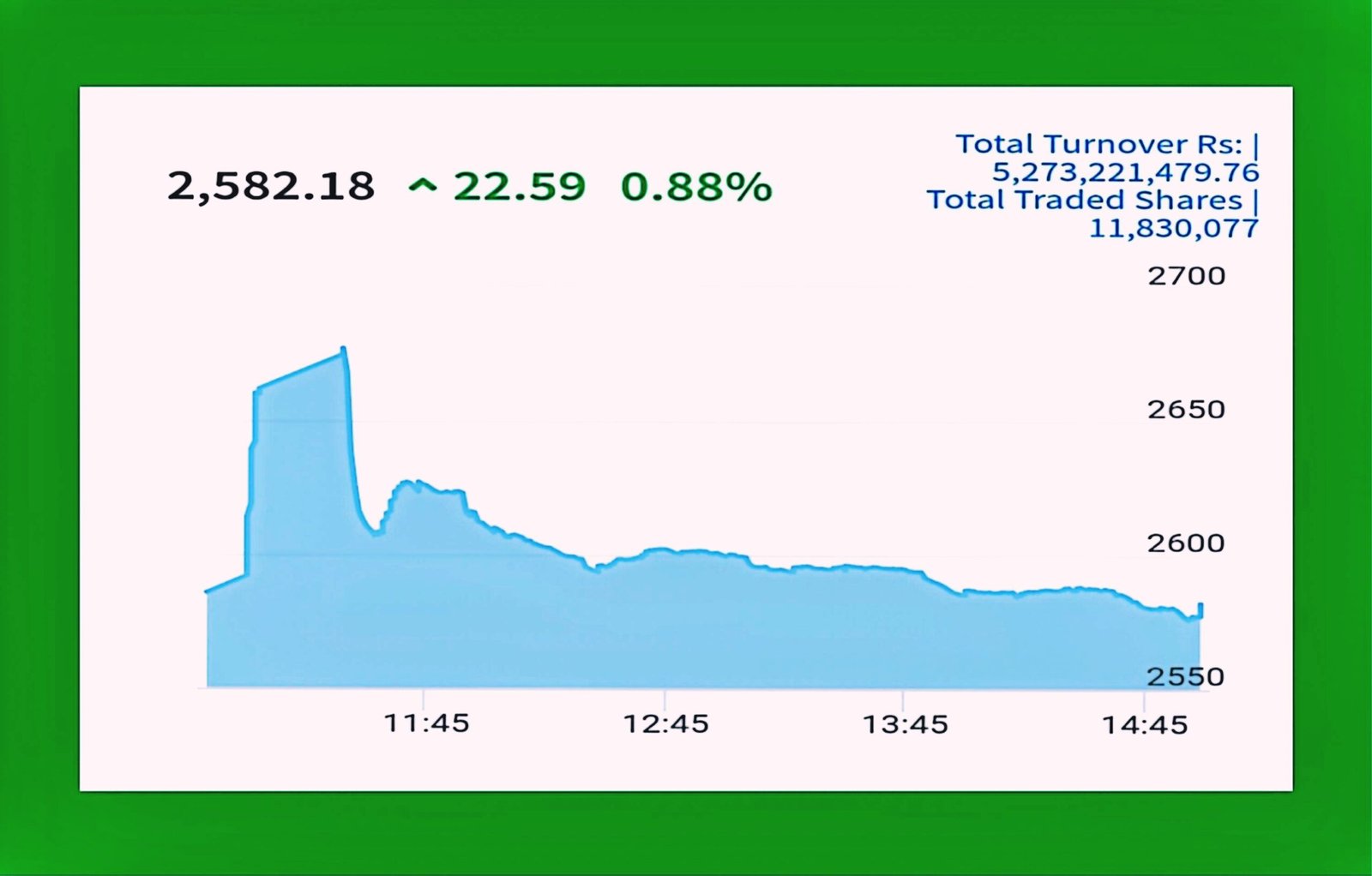 २०८२ असोज २३ काठमाडौं । दशैंपछि खुलेको सेयर बजार लगातार दुई दिन दोहोरो अंकको गिरावट आएर आज बजार पुन सम्हालिन पुगेको छ् । साताको तेस्रो कारोबारको दिन आज बजार २२.५९ अंकले बढेर २५८२.१८ बिन्दुमा अड्किएको छ । सेयर कारोबार ५ अर्व बढिको भएको छ ।