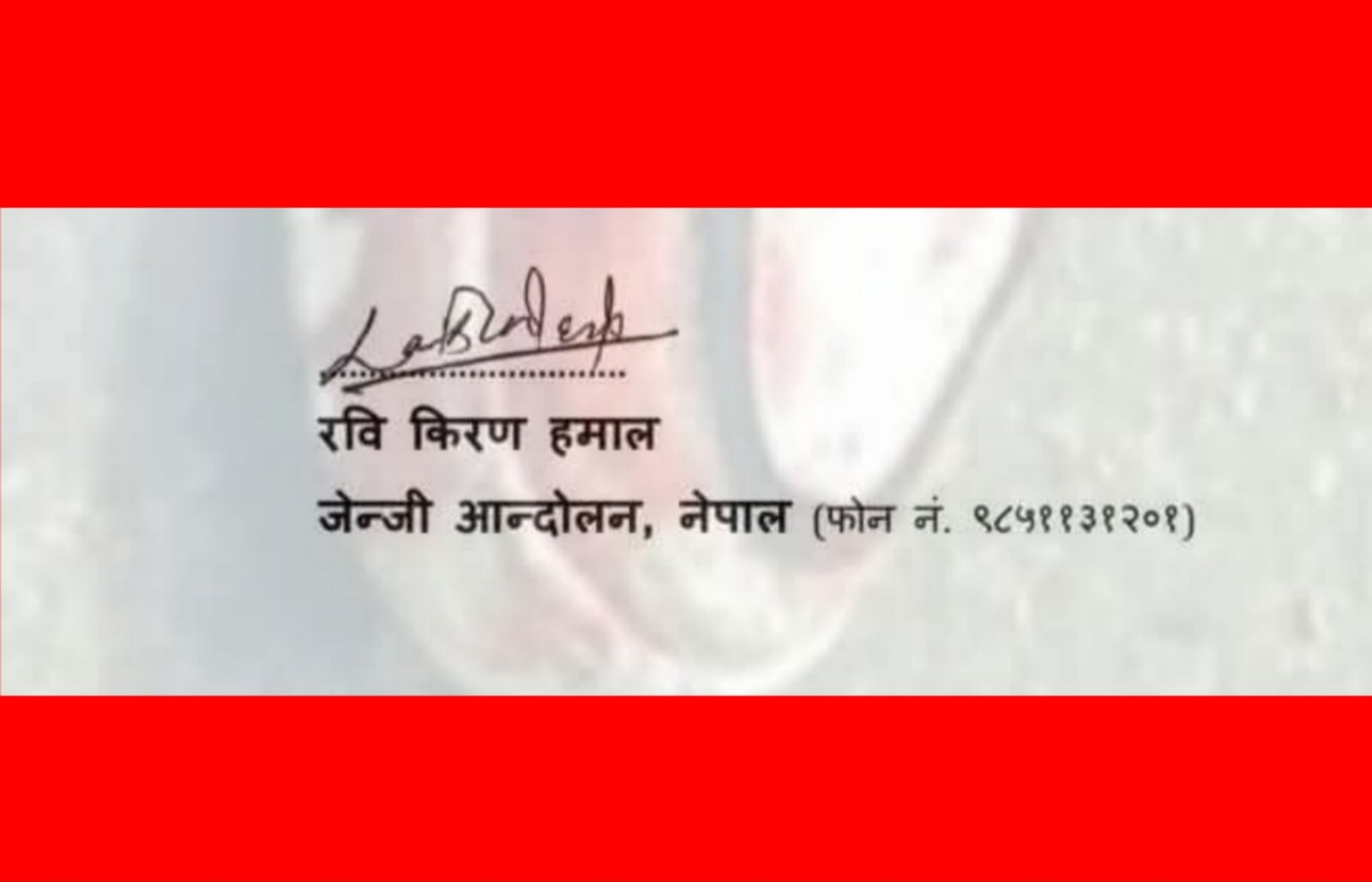 विनम्र निवेदन यो हो कि हालकी प्रधानमन्त्री सुशीला कार्कीले जेन्जी विद्रोहको क्रममा देशका युवाहरूको रगत माथि सत्ता कु गरेर प्रधानमन्त्री पदमा आसिन भएको अवस्था छ। उहाँको यो कदमले कानुनी परम्परा र जनताको म्यानडेटको स्पष्ट उल्लङ्घन गरेको छ। यसरी अवैधानिक तरिकाले सत्ता कब्जा गर्नु देशको गरिमा, गोपनीयता र राष्ट्रिय मर्यादाविपरीत भएको, र यसले गम्भीर राष्ट्रघातको खतरा उत्पन्न गरेको देखिन्छ।
