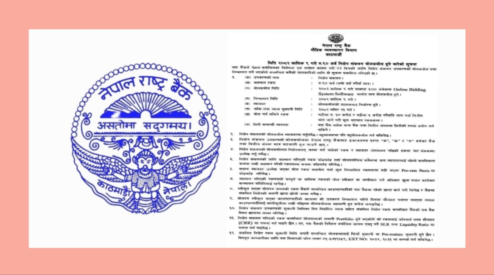 २०८२ कात्तिक ९ नेपाल । बजारमा अधिक तरलता भएपछि नेपाल राष्ट्र बैंकले देहाय बमोजिमका विशेषता एवं शर्तहरु कायम गरी ४२ दिनको लागि निक्षेप संकलन उपकरणको बोलकबोल तथा निष्काशन गरेको छ् ।
