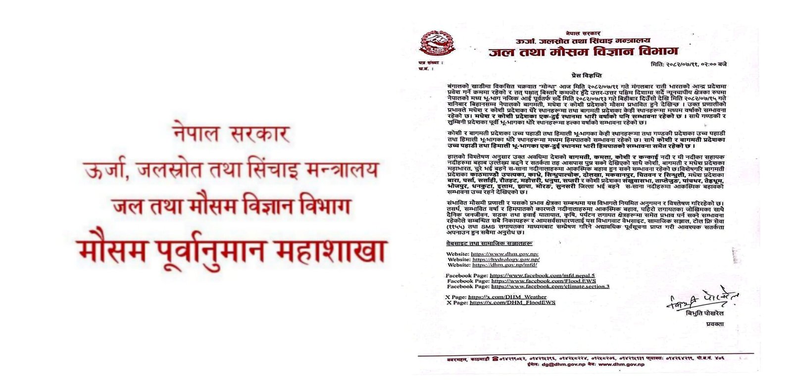 संभावित मौसमी प्रणाली र यसको प्रभाव क्षेत्रका सम्बन्धमा यस विभागले नियमित अनुगमन र विश्लेषण गरिरहेको छ। तसर्थ, सम्भावित वर्षा र हिमपातको कारणले नदीनालाहरुमा आकस्मिक बहाव, पहिरो लगायतका जोखिमका साथै दैनिक जनजीवन, सडक तथा हवाई यातायात, कृषि, पर्यटन लगायत क्षेत्रहरूमा समेत प्रभाव पर्न सक्ने सम्भावना रहेकोले सम्बन्धित सबै निकायहरू र आमसर्वसाधारणलाई यस विभागवाट वेभसाइट, सामाजिक सञ्जाल, टोल फ्रि सेवा (११५५) तथा एसएमएस लगायतका माध्यमबाट सम्प्रेषण गरिने अद्यावधिक पूर्वसूचना प्राप्त गरी आवश्यक सतर्कता अपनाउन हुन सबैमा अनुरोध छ। जल तथा मौसम विज्ञान विभागले आज जारी गरेको प्रेस बिज्ञप्तीमा भनिएको छ् ।