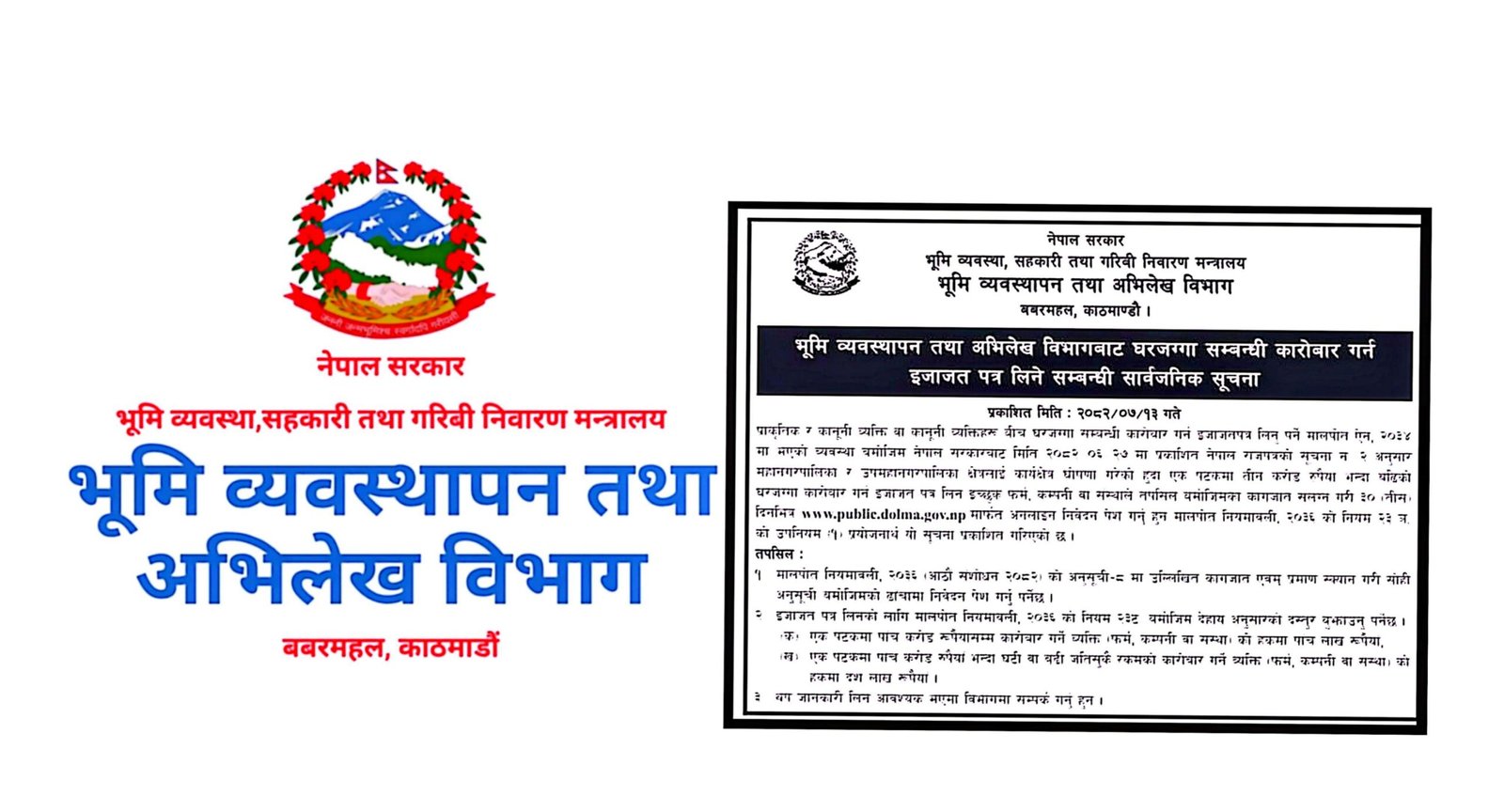 २०८२ कात्तिक १४ नेपाल । ´प्राकृतिक र कानूनी व्यक्ति वा कानूनी व्यक्तिहरू बीच घरजग्गा सम्बन्धी कारोवार गर्न इजाजतपत्र लिनु पर्ने मालपोत ऐन, २०३४ मा भएको व्यवस्था वमोजिम नेपाल सरकारवाट मिति २०८२/०६/२७ मा प्रकाशित नेपाल राजपत्रको सूचना नं. २ अनुसार महानगरपालिका र उपमहानगरपालिका क्षेत्रलाई कार्यक्षेत्र घोषणा गरेको हुँदा एक पटकमा तीन करोड रुपैया भन्दा बढिको घरजग्गा कारोवार गर्न इजाजत पत्र लिन इच्छुक फर्म, कम्पनी वा संस्थाले तपसिल बमोजिमका कागजात संलग्न गरी ३० (तीस) दिनभित्र www.public.dolma.gov.np मार्फत अनलाइन निवेदन पेश गर्नु हुन मालपोत नियमावली, २०३६ को नियम २३ ज. को उपनियम (१) प्रयोजनार्थ सूचना प्रकाशित भएको छ ।