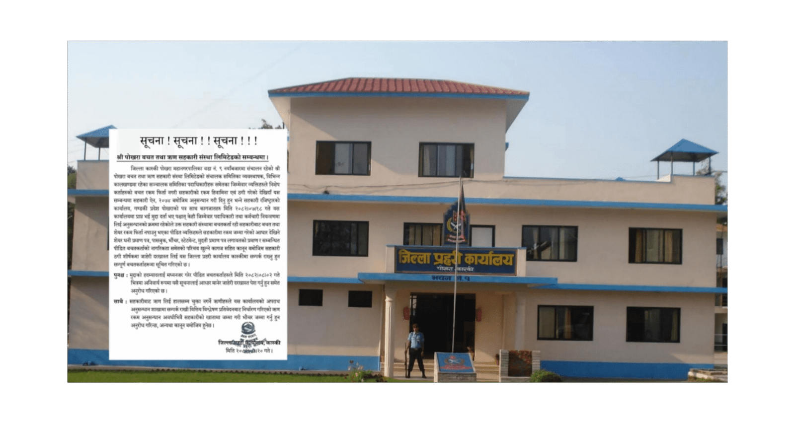२०८२ कात्तिक २१ नेपाल । जिल्ला कास्की पोखरा महानगरपालिका वडा नं. ९ नयाँबजारमा संचालन रहेको श्री पोखरा बचत तथा ऋण सहकारी संस्था लिमिटेडको संचालक समितिका व्यवस्थापक, विभिन्न कालखण्डमा रहेका सञ्चालक समितिका पदाधिकारीहरू समेतका जिम्मेवार व्यक्तिहरुले निक्षेप कर्ताहरुको बचत रकम फिर्ता नगरी सहकारीको रकम हिनामिना एबं ठगी गरेको देखिदाँ यस सम्बन्धमा सहकारी ऐन, २०७४ बमोजिम अनुसन्धान गरी दिनु हुन भन्ने सहकारी रजिष्ट्रारको कार्यालय, गण्डकी प्रदेश पोखराको पत्र साथ कागजातहरु मिति २०८२।०७।१८ गते यस कार्यालयमा प्राप्त भई मुद्दा दर्ता भए पश्चात् केही जिम्मेवार पदाधिकारी तथा कर्मचारी नियन्त्रणमा लिई अनुसन्धानको क्रममा रहेकोले उक्त सहकारी संस्थामा बचतकर्ता रही सहकारीबाट बचत तथा शेयर रकम फिर्ता नपाउनु भएका पीडित व्यक्तिहरुले सहकारीमा रकम जम्मा गरेको आधार देखिने शेयर धनी प्रमाण पत्र, पासबुक, भौंचर, स्टेटमेन्ट, मुद्दती प्रमाण पत्र लगायतको प्रमाण र सम्बन्धित पीडित बचतकर्ताको नागरिकता समेतको परिचय खुल्ने कागज सहित कानून बमोजिम सहकारी ठगी शीर्षकमा जाहेरी दरखास्त लिई यस जिल्ला प्रहरी कार्यालय कास्कीमा सम्पर्क राख्नु हुन सम्पूर्ण बचतकर्ताहरूमा सूचित गरिएको छ ।