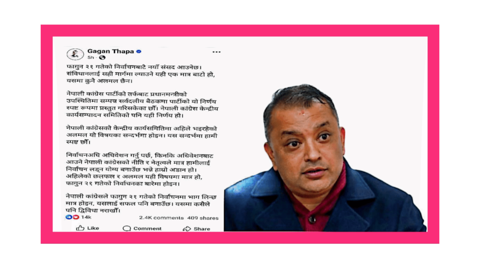 नेपाली कांग्रेसका महामन्त्री गगन थापाले आफ्नो फेसबुकमा लेखेका छन् ।