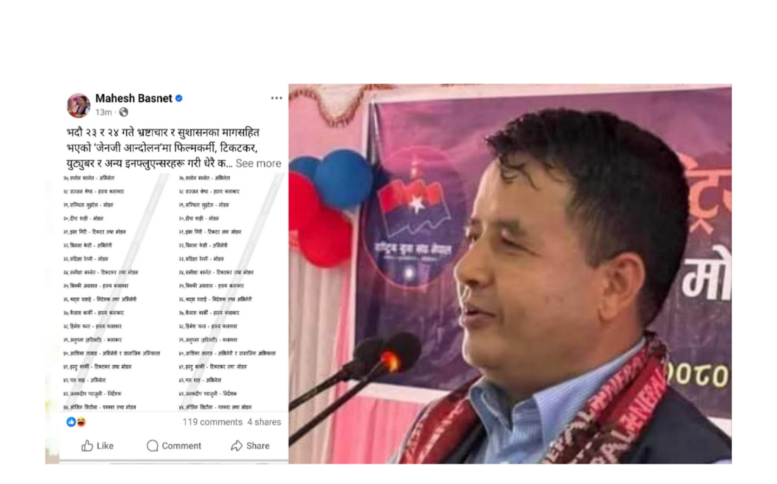 कात्तिक २८ नेपाल । भदौ २३ र २४ गते ´भ्रष्टाचार र सुशासनका मागसहित भएको ‘जेनजी आन्दोलन’मा फिल्मकर्मी, टिकटकर, युट्युबर र अन्य इनफ्लुएन्सरहरू गरी धेरै कलाकर्मीहरू सहभागी बने। कतिपयले सामाजिक सञ्जालमार्फत समर्थन जनाए भने कतिपय सडकमै उत्रिए`।