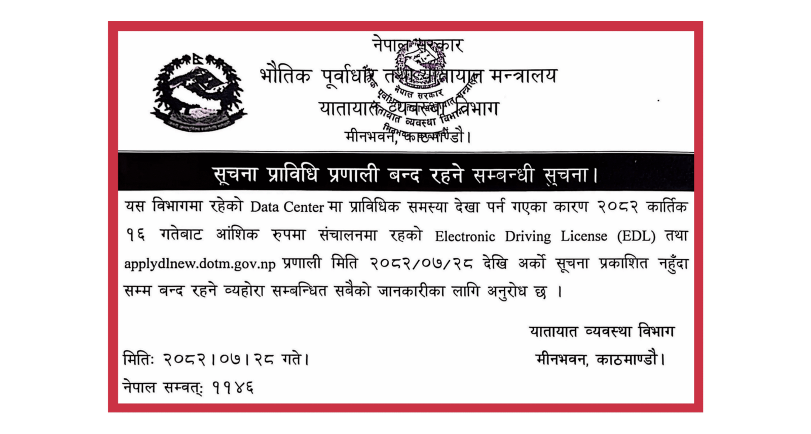 कात्तिक २८ नेपाली । यातायात बिभाग मिनभवन काठमाडौं मा रहेको डाटा सेन्टरमा प्राविधिक समस्या देखा पर्न गएका कारण २०८२ कार्तिक १६ गतेबाट आंशिक रुपमा संचालनमा रहको ईलोक्ट्रोनिक्स ड्राइभर लाईसेन्स प्रणालीमा पुन समस्या भएकोले मिति २०८२/०७/२८ देखि अर्को सूचना प्रकाशित नहुँदा सम्म पुर्ण रुपमा बन्द रहने व्यहोरा सम्बन्धित सबैको जानकारीका लागि यातायात बिभाग मिनभवन काठमाडौंले सूचना प्रकाशित गरेको छ ।