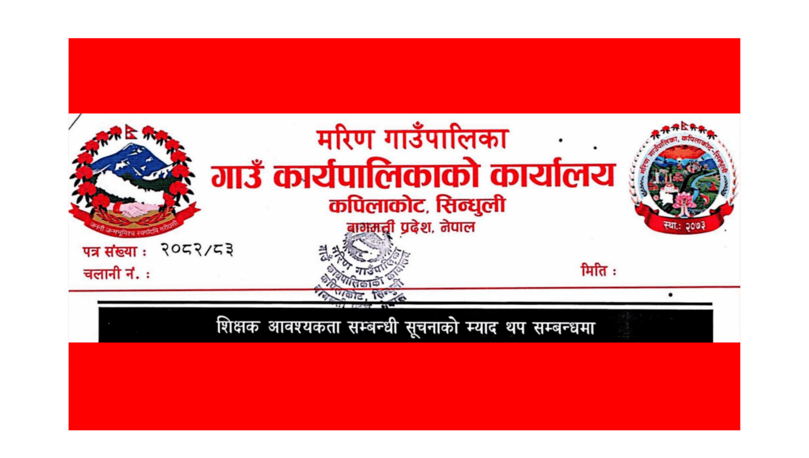 बिद्यालय शिक्षक छनौट समितिको मिति २०८२ कात्तिक १४ गतेको निर्णयानुसार करारमा शिक्षक नियुक्ति सम्बन्धी तोकिएको मिति भित्र विद्यालयमा योग्यता पुगेका ईच्छुक नेपाली नागरिकले सात दिन भित्र रित पूर्वकको दरखास्त दिन मरिण गाउँपालिकाको कार्यालय कपिलाकोट सिन्धुलीले सूचना प्रकाशित गरेको छ।