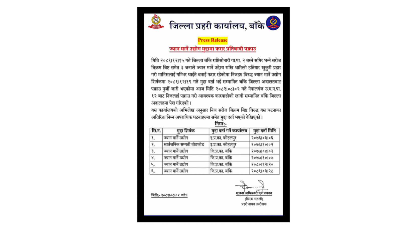 मंसिर ३ नेपाल । मिति २०८१ चैत १५ गते बाँके जिल्ला राप्तिसोनारी गा.पा. २ बस्ने समिर भन्ने सरोज बिक्रम बिष्ट समेत ३ जनाले ज्यान मार्ने उद्देश्य राखि धारिलो हतियार खुकुरी प्रहार गरी मानिसलाई गम्भिर घाईते बनाई फरार रहेकोमा निजहरु विरुद्ध ज्यान मार्ने उद्योग शिर्षकमा २०८१ चैत १९ गते मुद्दा दर्ता भई सम्मानित बाँके जिल्ला अदालतबाट पक्राउ पुर्जी जारी भएकोमा मिति २०८२ मंसिर २ गते नेपालगंज उ.म.न.पा. १२ बाट निजलाई पक्राउ गरी आवश्यक कारवाहीको लागी सम्मानित बाँके जिल्ला अदालतमा पेश गरिएको ।