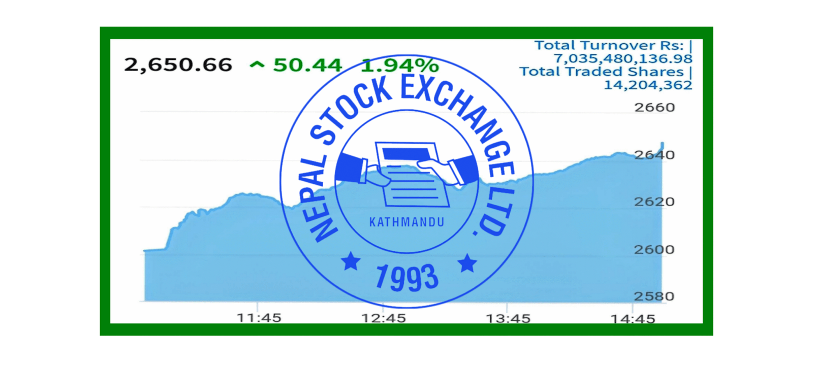 मंसिर ८ नेपाल । आज सेयर बजार नेप्से ५०.४४ अंक अर्थात १.९४ प्रतिशतले बढेर २६५०.६६ विन्दुमा बजार बन्द भएको छ। सेयर किनबेच ७अर्व ३करोड ५४लाख ८०हजार १सय ३६ दसमलव ९८ रुपैयाँ बराबरको सेयर कारोबार भएको छ।