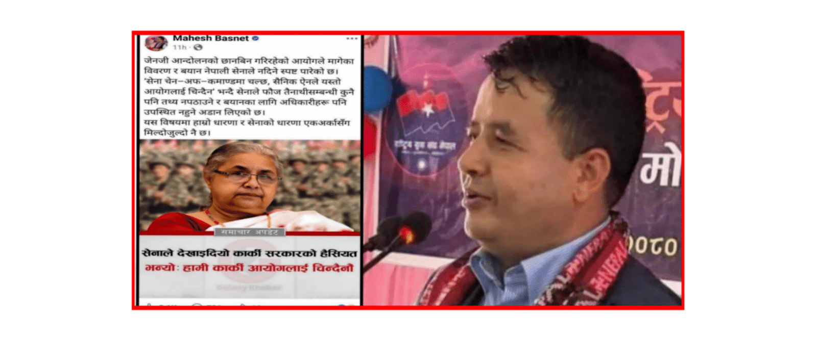 मंसिर ९ नेपाल । नेकपा एमालेका पोलिटब्युरो सदस्य महेस बस्नेत लेख्छन् :जेनजी आन्दोलनको छानबिन गरिरहेको आयोगले मागेका विवरण र बयान नेपाली सेनाले नदिने स्पष्ट पारेको छ।