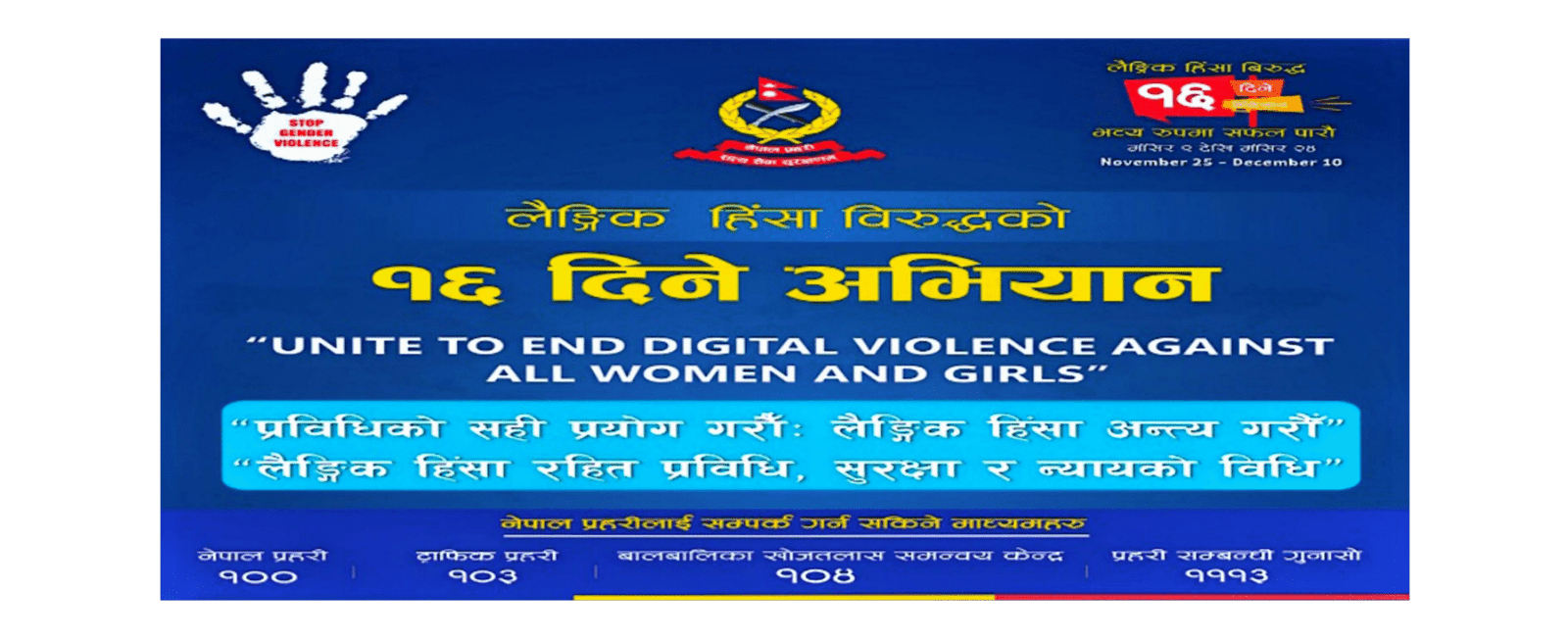 प्रविधिको सही प्रयोग गरौं: लैङ्गिक हिंसा अन्त्य गरौं भन्ने राष्ट्रिय नारा र लैङ्गिक हिंसा रहित प्रविधि, सुरक्षा र न्यायको विधि भन्ने नेपाल प्रहरीको नारा सहित नेपाल प्रहरी प्रधान कार्यालयमा लैङ्गिक हिंसा विरूद्धको १६ दिने अभियानको अवसरमा आइतबार आयोजित विशेष समारोहलाई सम्बोधन गर्दै प्रहरी महानिरीक्षक कार्कीले उक्त कुरा बताउनुभएको हो ।