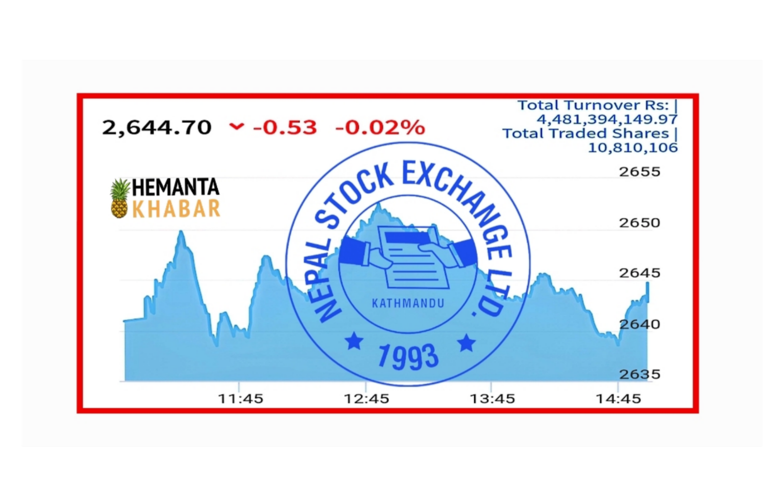 मंसिर १६ नेपाल । आज सेयर बजार नेप्से ०.५३ अंक अर्थात ०.०२ प्रतिशतले घटेर र २६४४.७० विन्दुमा बजार बन्द भएको छ । सेयर किनबेच ४अर्व ४८करोड १३लाख ९४हजार १ सय ४९ रुपैयाँ दसमलव ९७पैसा बराबरको सेयर किनबेच भएको छ।