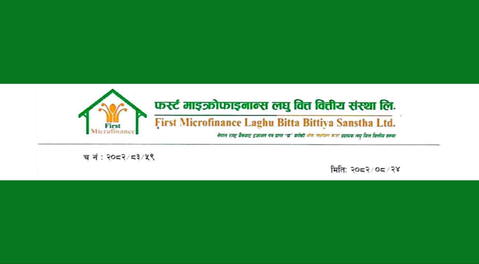फर्स्ट माइक्रोफाइनान्स लघुवित्त वित्तीय संस्था लिमिटेडको मिति २०८२ मंसिर २४ गते बसेको सञ्चालक समितिको २४४ औं बैठकको निर्णय वमोजिम आ.व. २०८१/८२ सम्मको वितरणयोग्य मुनाफाबाट २०८२ असार मसान्तको कुल चुक्ता पूँजी रु. १,३४,४८,७१,३२३ को लाभांश दिने जानकारी दिएको छ ।