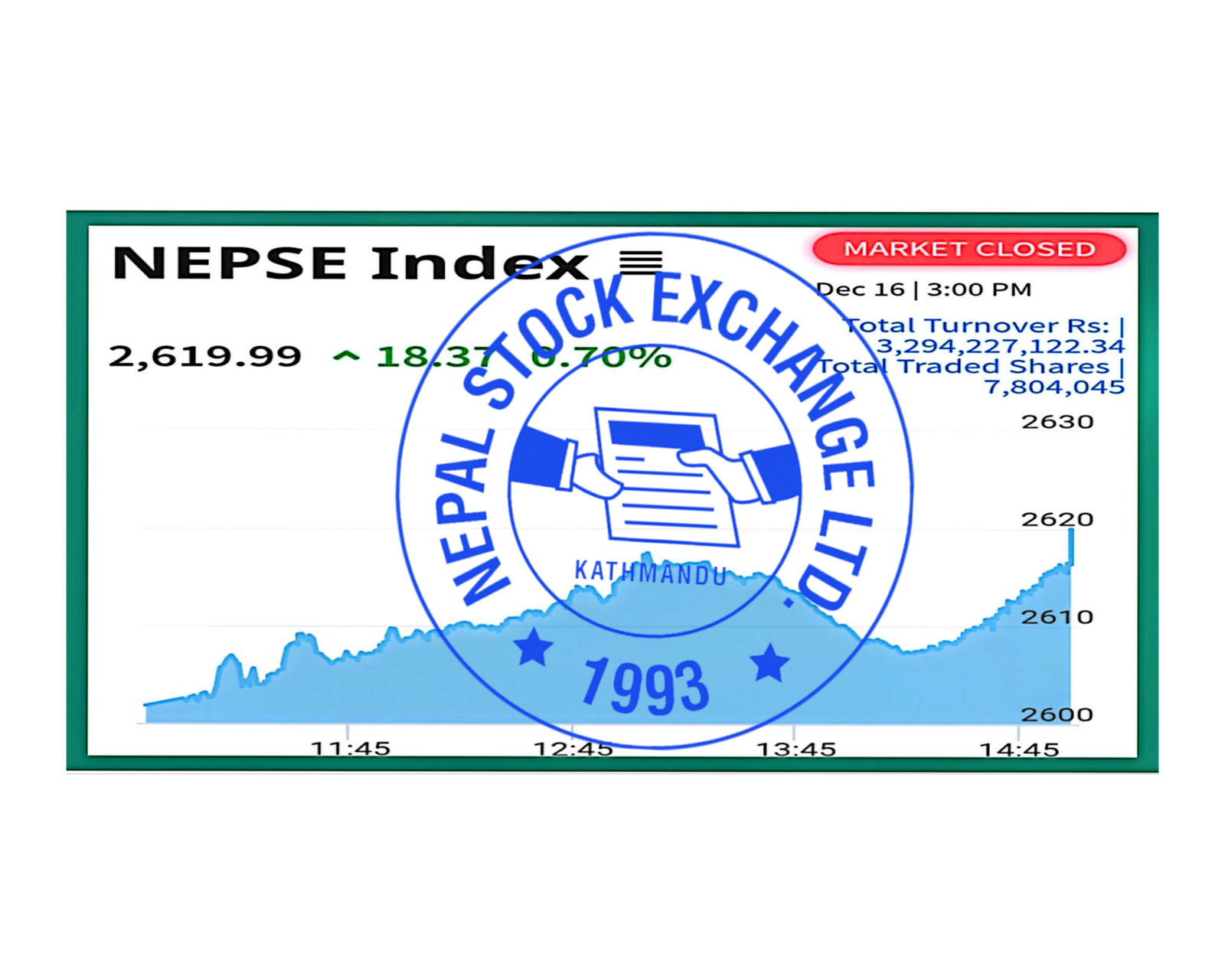 पुस १ नेपाल । आज सेयर बजार नेप्से १८.३७ अंक अर्थात ०.७० प्रतिशतले बढेर र २६१९.९९ विन्दुमा बजार बन्द भएको छ । आज सेयर किनबेच ३अर्व २९करोड ४२लाख २७हजार १सय २२रुपैयाँ दशमलव ३४ पैसा बराबरको सेयर किनबेच भएको छ।