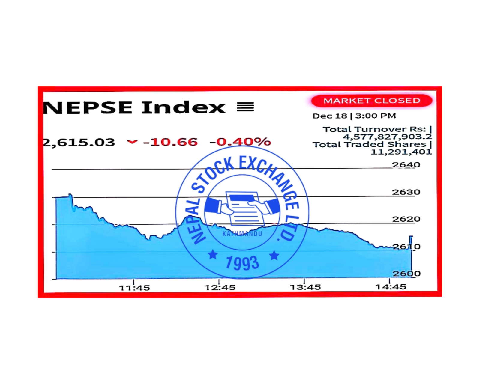 आज सेयर बजार नेप्से १०.६६ अंक अर्थात ०.४० प्रतिशतले बढेर र २६१५.०३ विन्दुमा बजार बन्द भएको छ । आज सेयर किनबेच ४अर्व ५७करोड ७८लाख २७हजार ९सय ३रुपैयाँ दशमलव २पैसा बराबरको सेयर किनबेच भएको छ।