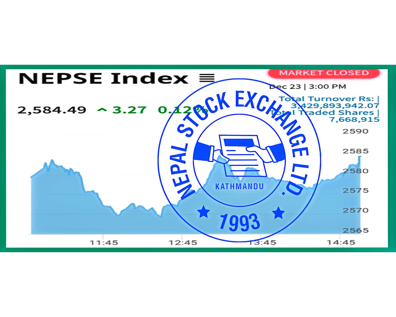 आज सेयर बजार नेप्से ३.२७ अंक अर्थात ०.१२ प्रतिशतले बढ्यो र २५८४.४९ विन्दुमा बजार बन्द भएको छ । आज सेयर किनबेच ३अर्व ४२करोड ९८लाख ९३हजार ९सय ४२रुपैयाँ दशमलव ०७पैसा बराबरको सेयर किनबेच भएको छ।