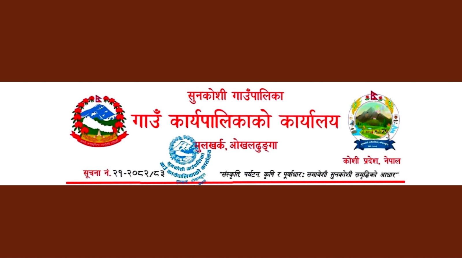 ओखलढुंगा जिल्लाको सुनकोशी गाउँपालिकाको आर्थिक वर्ष ०८२/८३ को वार्षिक स्वीकृत कार्यक्रम बमोजिम सुनकोशी गाउँपालिका वडा नं १० स्थीत कार्यक्रम कार्यान्वयन सञ्चालन क्षेत्र तोकि प्रदेश सशर्त अनुदान तर्फको ५० प्रतिशत अनुदानमा मौरीपालन प्रबर्द्धन कार्यक्रम बमोजिम मौरीगोला सहितको घार वितरण कार्यक्रम रहेको हुँदा प्रदेश सरकार उद्योग कृषि तथा सहकारी मन्त्रालयबाट स्थानीय तहहरुमा वित्तीय हस्तान्तरण मार्फत सशर्त अनुदान कार्यक्रम सञ्चालन सम्बन्धी मार्गदर्शन- २०८२ को अधिनमा रही सञ्चालन हुने भएकोले इच्छुक कृषक/कृषक समूह/कृषि सहकारी/कृषि फर्महरुबाट दरखास्त दिन कार्यलयले आव्हान गरेको छ।