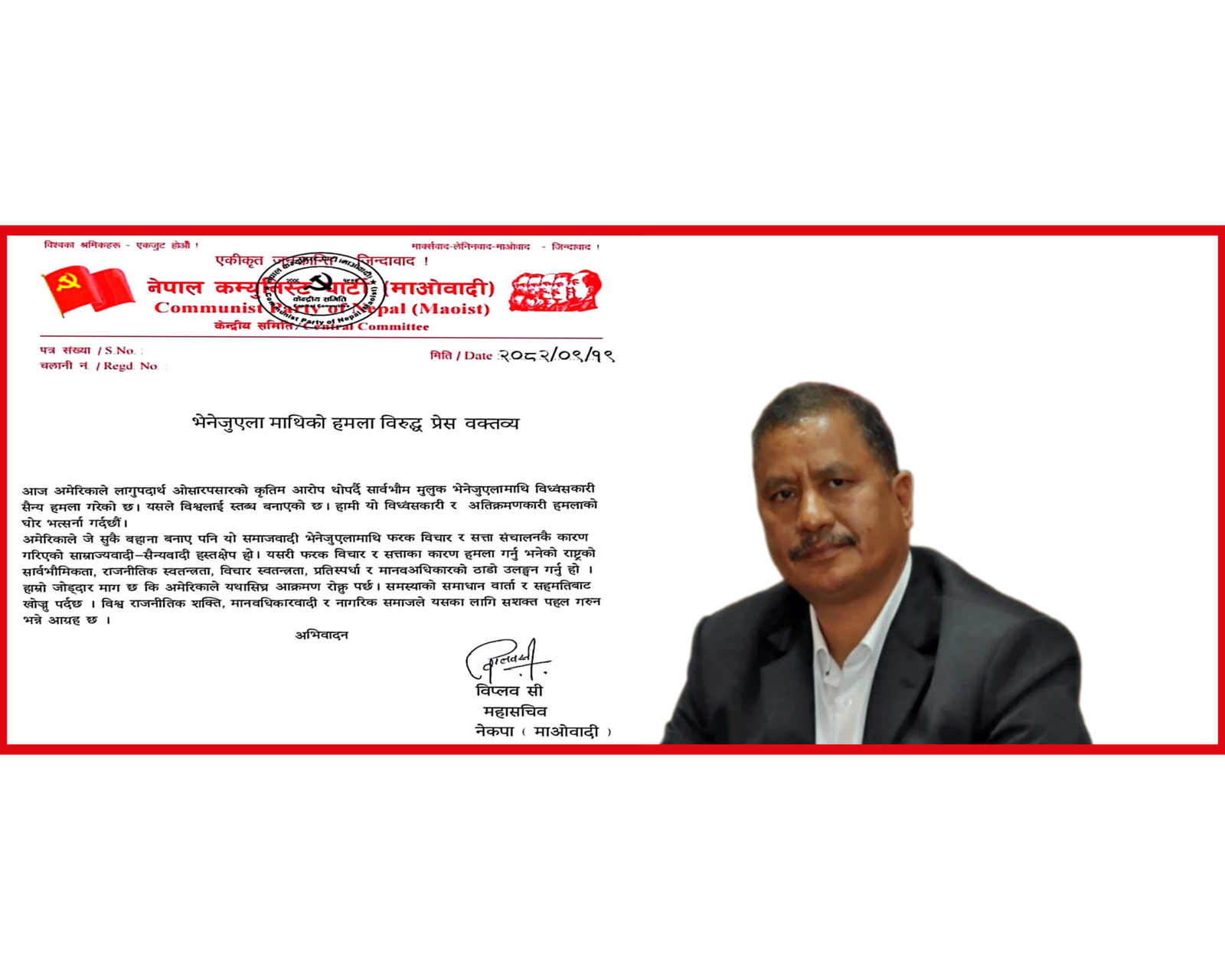 अमेरिकाले जे सुकै बहाना बनाए पनि यो समाजवादी भेनेजुएलामाथि फरक विचार र सत्ता संचालनकै कारण गरिएको साम्राज्यवादी-सैन्यवादी हस्तक्षेप हो। यसरी फरक विचार र सत्ताका कारण हमला गर्नु भनेको राष्ट्रको सार्वभौमिकता, राजनीतिक स्वतन्त्रता, विचार स्वतन्त्रता, प्रतिस्पर्धा र मानवअधिकारको ठाडो उलङ्घन गर्नु हो । हाम्रो जोड्दार माग छ कि अमेरिकाले यथासिघ्र आक्रमण रोक्नु पर्छ। समस्याको समाधान वार्ता र सहमतिबाट खोज्जु पर्दछ । विश्व राजनीतिक शक्ति, मानवधिकारवादी र नागरिक समाजले यसका लागि सशक्त पहल गरुन भन्ने आग्रह छ । नेपाल कम्युनिस्ट पार्टी माओवादीका महासचिव नेत्र बिक्रम चन्द(बिप्लव) ले हस्ताक्षर गरि जारी भएको प्रेस बिज्ञप्तिमा उल्लेख रहेको छ।