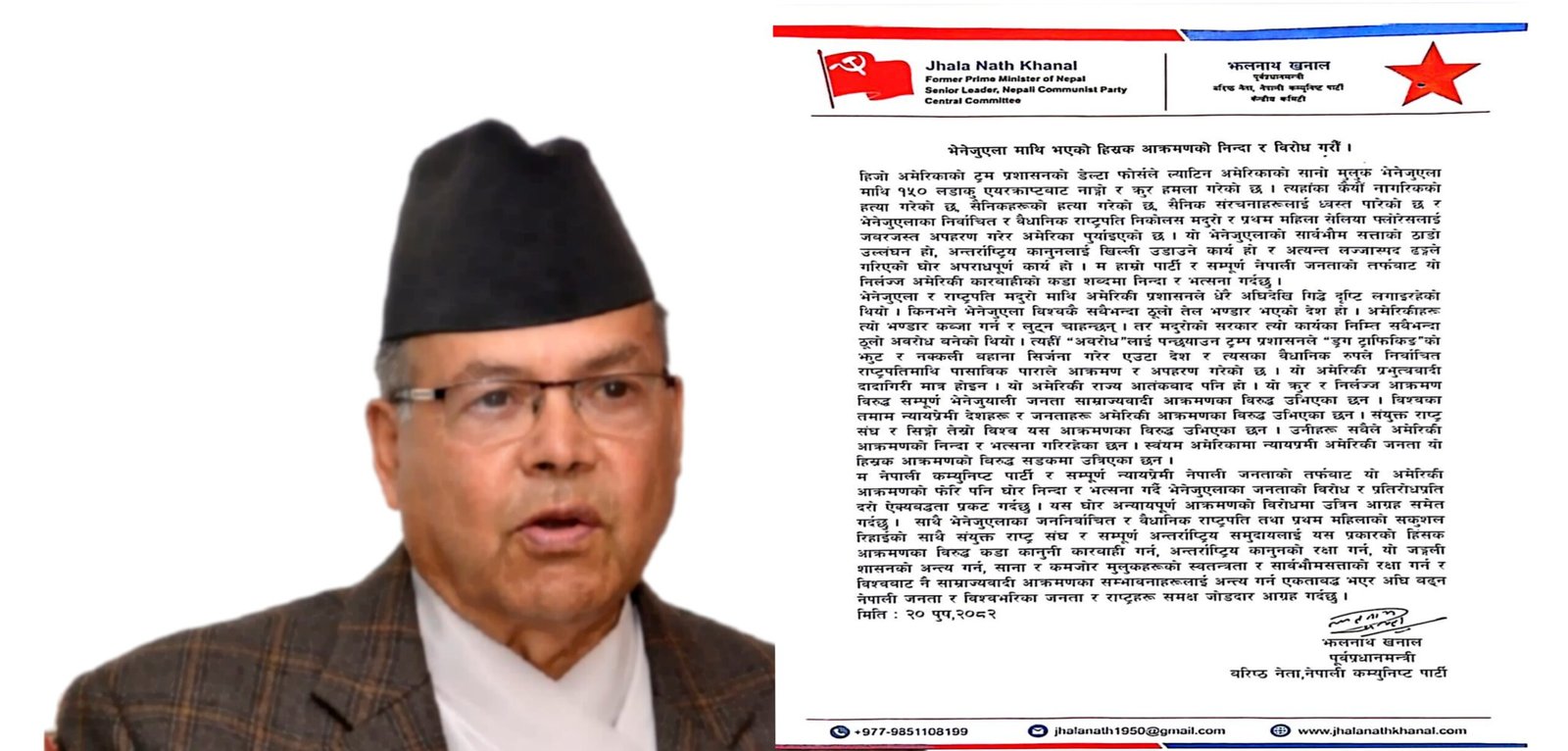 म नेपाली कम्युनिष्ट पार्टी र सम्पूर्ण न्यायप्रेमी नेपाली जनताको तर्फवाट यो अमेरिकी आक्रमणको फेरि पनि घोर निन्दा र भत्सना गर्दै भेनेजुएलाका जनताको विरोध र प्रतिरोधप्रति दरो ऐक्यवद्धता प्रकट गर्दछु। यस घोर अन्यायपूर्ण आक्रमणको विरोधमा उत्रिन आग्रह समेत गर्दछु । साथै भेनेजुएलाका जननिर्वाचित र वैधानिक राष्ट्रपति तथा प्रथम महिलाको सकुशल रिहाईको साथै संयुक्त राष्ट्र संघ र सम्पूर्ण अन्तर्राष्ट्रिय समुदायलाई यस प्रकारको हिंसक आक्रमणका विरुद्ध कडा कानुनी कारवाही गर्न, अन्तर्राष्ट्रिय कानुनको रक्षा गर्न, यो जङ्गली शासनको अन्त्य गर्न, साना र कमजोर मुलुकहरूको स्वतन्त्रता र सार्वभौमसत्ताको रक्षा गर्न र विश्वबाट नै साम्राज्यवादी आक्रमणका सम्भावनाहरूलाई अन्त्य गर्न एकतावद्ध भएर अघि वढ्न नेपाली जनता र विश्वभरिका जनता र राष्ट्रहरू समक्ष जोडदार आग्रह गर्दछु पुर्व प्रधानमन्त्री झलनाथ खनालले जारी गरेको प्रेस बिज्ञप्तिमा उल्लेख रहेको छ।