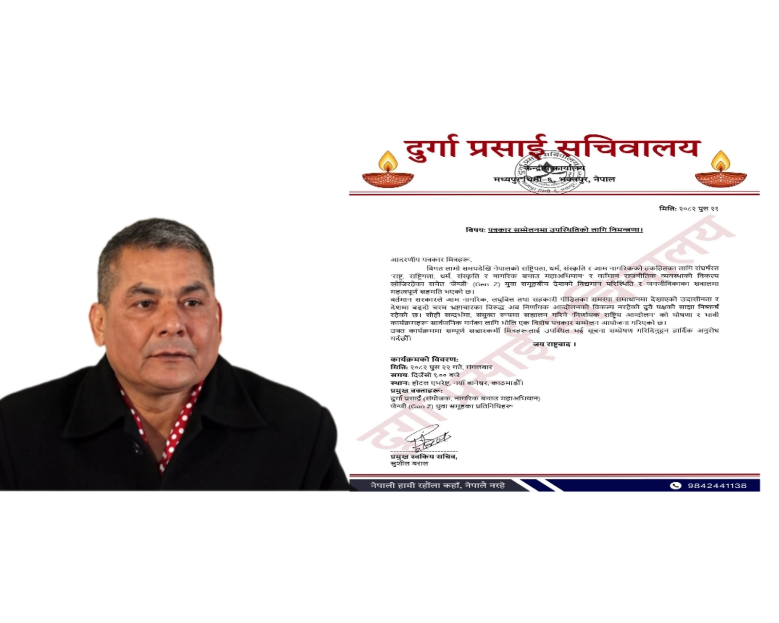 दुर्गा प्रसाईं (संयोजक, नागरिक बचाउ महाअभियान) र जेन्जी युवा समूहका प्रतिनिधिहरू रहने नागरिक बचाउ अभियानले जारी गरेको निम्तो पत्रमा उल्लेख रहेको छ।