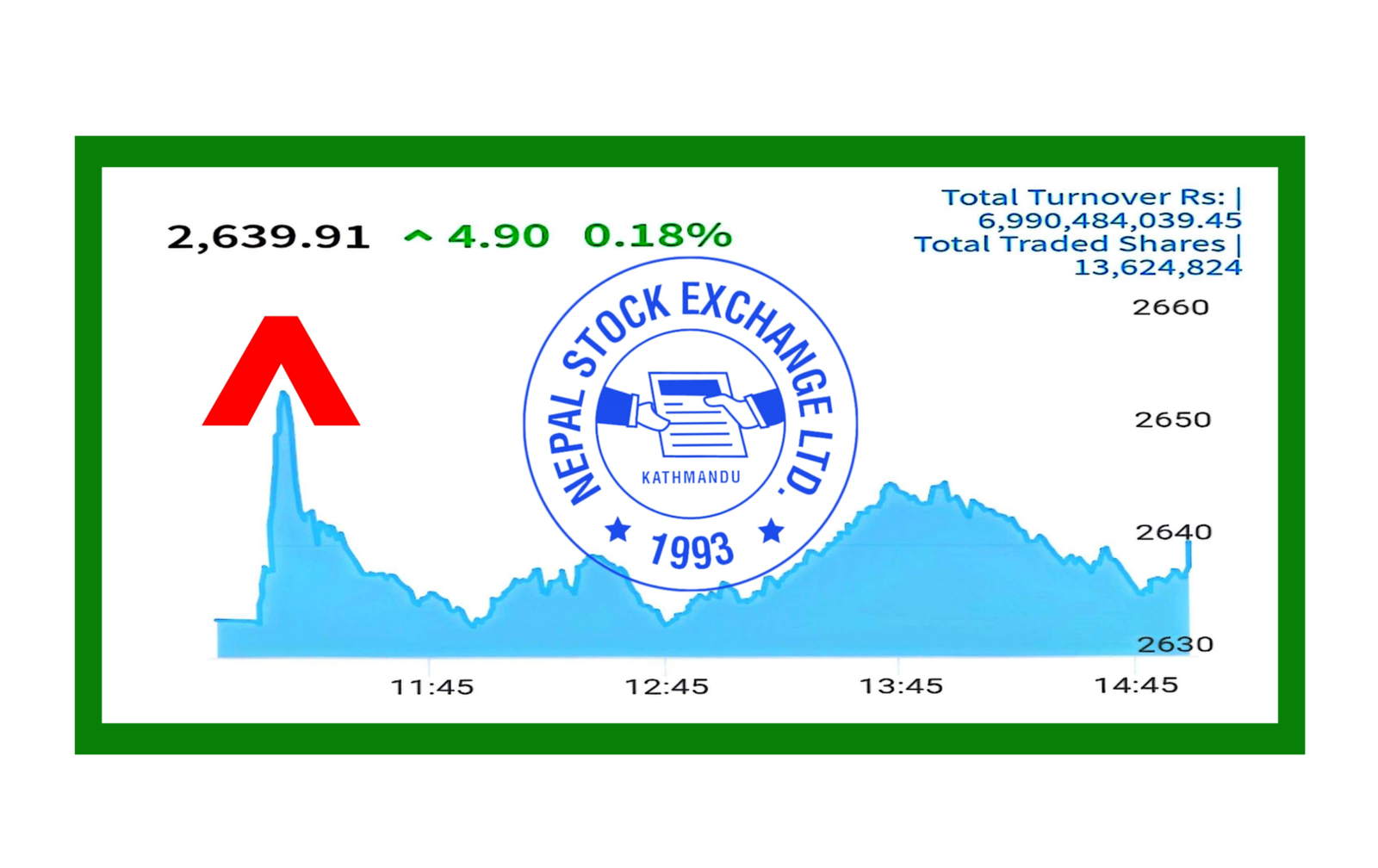 आज सेयर बजार नेप्से ४.९० अंक अर्थात ०.१८ प्रतिशतले बढेर २६३९.९१ विन्दुमा बजार बन्द भएको छ । आज सेयर किनबेच ६अर्व ९९करोड ४लाख ८४हजार ३९रुपैयाँ दशमलव ४५पैसा बराबरको सेयर किनबेच भएको छ।
