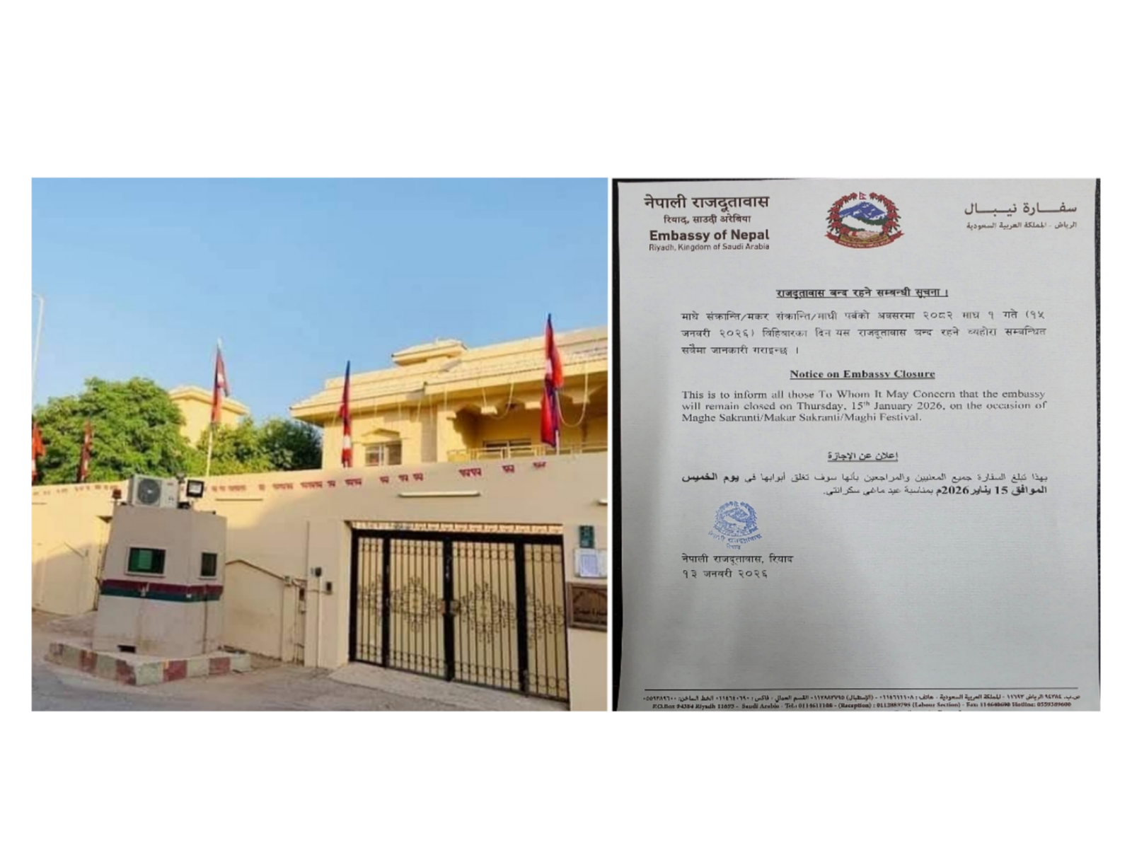 माघे संक्रान्ति/मकर संक्रान्ति/माघी पर्वको अवसरमा २०८२ माघ १ गते बिहिबारका दिन नेपाली राजदूतावास रियाद बन्द रहने व्यहोरा राजदुतावासले सम्बन्धित सबैमा जानकारी गराएको छ ।