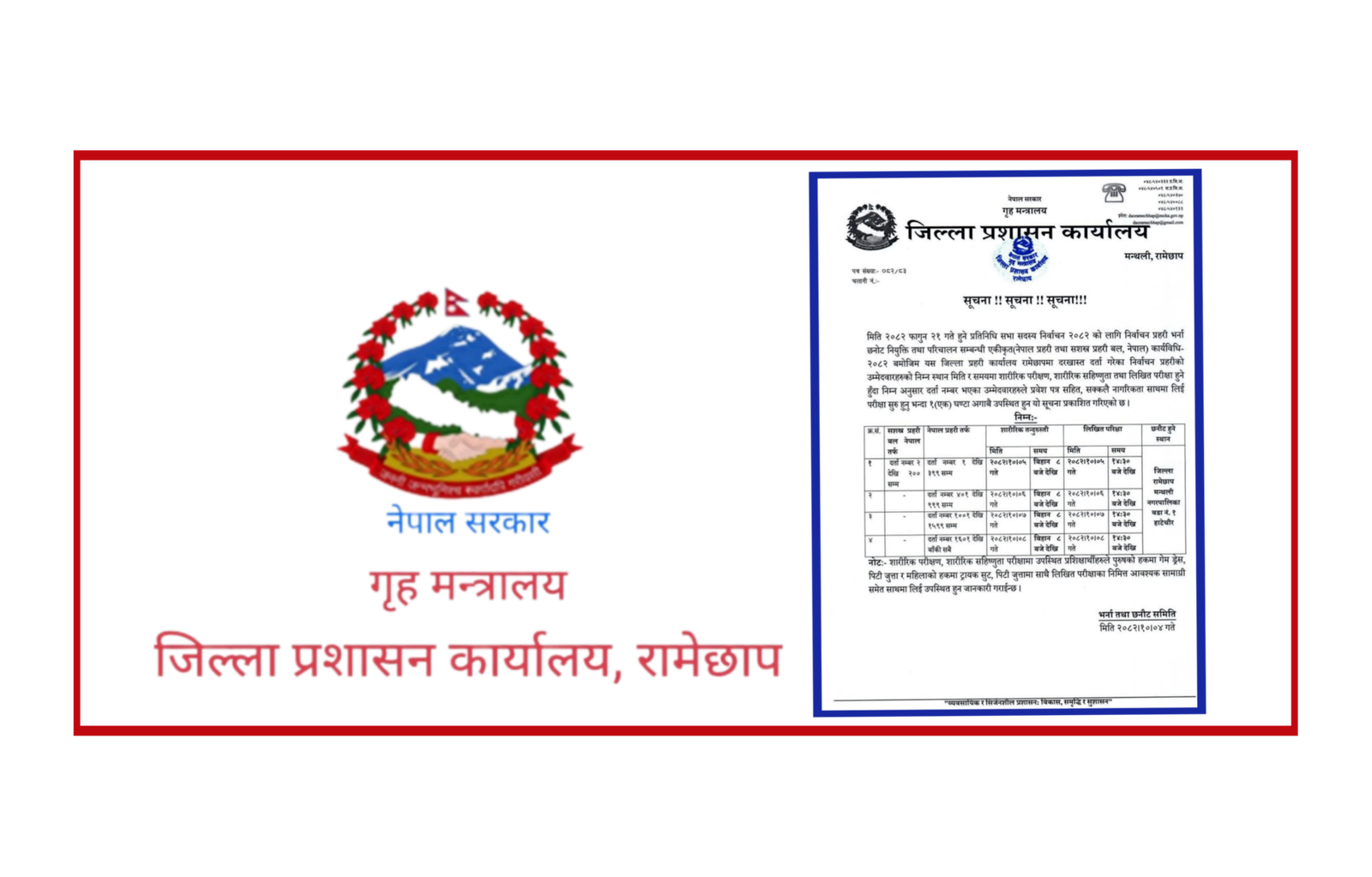 मिति २०८२ फागुन २१ गते हुने प्रतिनिधि सभा सदस्य निर्वाचन २०८२ को लागि निर्वाचन प्रहरी भर्ना छनोट नियुक्ति तथा परिचालन सम्बन्धी एकीकृत (नेपाल प्रहरी तथा सशस्त्र प्रहरी बल, नेपाल) कार्यविधि-२०८२ बमोजिम जिल्ला प्रहरी कार्यालय रामेछापमा दरखास्त दर्ता गरेका निर्वाचन प्रहरीको उम्मेदवारहरुको शारीरिक परीक्षण, शारीरिक सहिष्णुता तथा लिखित परीक्षा हुने भएको छ।