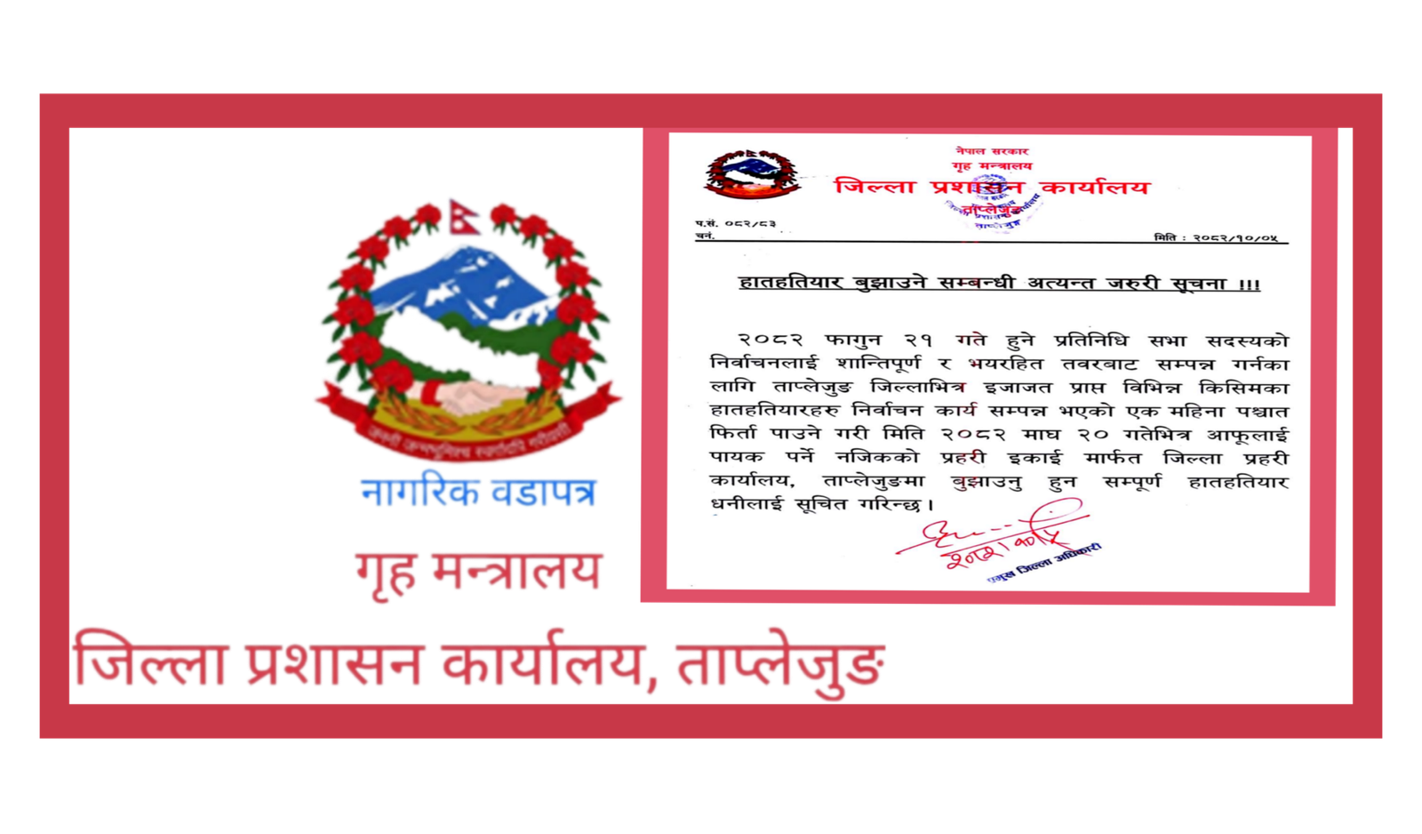 २०८२ फागुन २१ गते हुने प्रतिनिधि सभा सदस्यको निर्वाचनलाई शान्तिपूर्ण र भयरहित तवरबाट सम्पन्न गर्नका लागि ताप्लेजुङ जिल्लाभित्र इजाजत प्राप्त विभिन्न किसिमका हातहतियारहरु निर्वाचन कार्य सम्पन्न भएको एक महिना पश्चात फिर्ता पाउने गरी मिति २०८२ माघ २० गतेभित्र आफूलाई पायक पर्ने नजिकको प्रहरी इकाई मार्फत जिल्ला प्रहरी कार्यालय, ताप्लेजुङमा बुझाउनु हुन सम्पूर्ण हातहतियार धनीलाई जिल्ला प्रशासन कार्यलय ताप्लेजुङले सूचना जारी गरेको छ ।