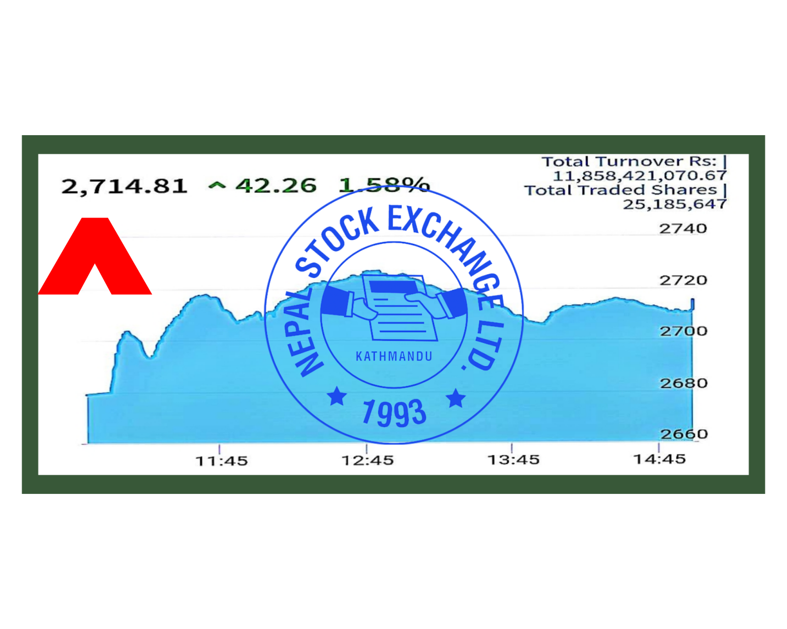 आज सेयर बजार नेप्से ४२.२६अंक अर्थात १.५८प्रतिशतले बढेर २७१४.८१ विन्दुमा बजार बन्द भएको छ । आज सेयर किनबेच ११अर्व ८५करोड ८४लाख २१हजार ७०रुपैयाँ दशमलव ६७पैसा बराबरको सेयर किनबेच भएको छ।