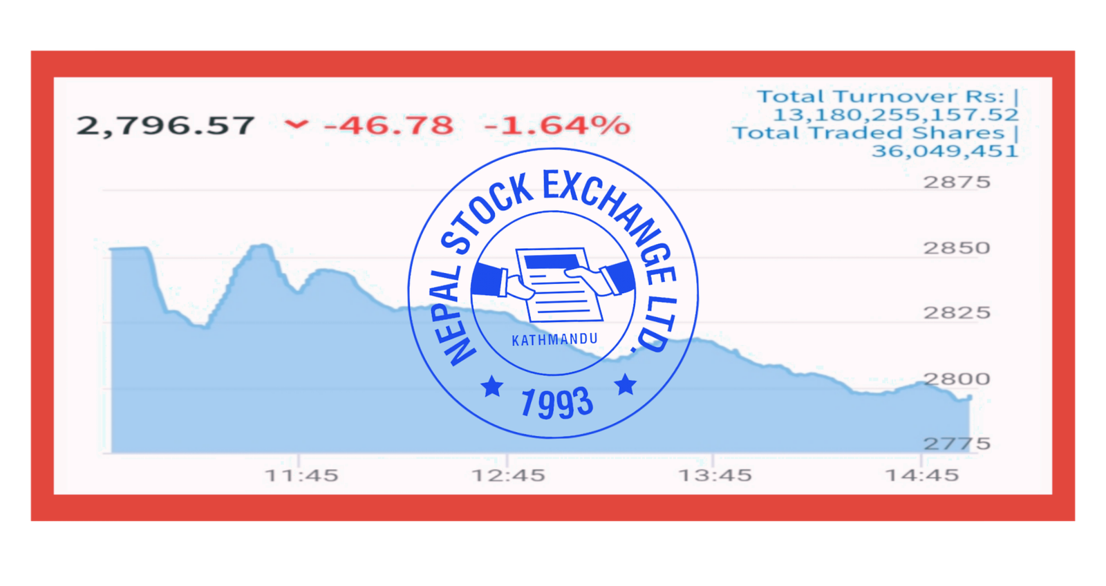 आज सेयर बजार नेप्से ३८.५२अंक अर्थात १.६४ प्रतिशतले घटेर २७९६.५७ विन्दुमा बजार बन्द भएको छ । आज सेयर किनबेच १३अर्व १८करोड २लाख ५५हजार १सय ५७रुपैयाँ दशमलव ५२पैसा बराबरको सेयर किनबेच भएको छ।
